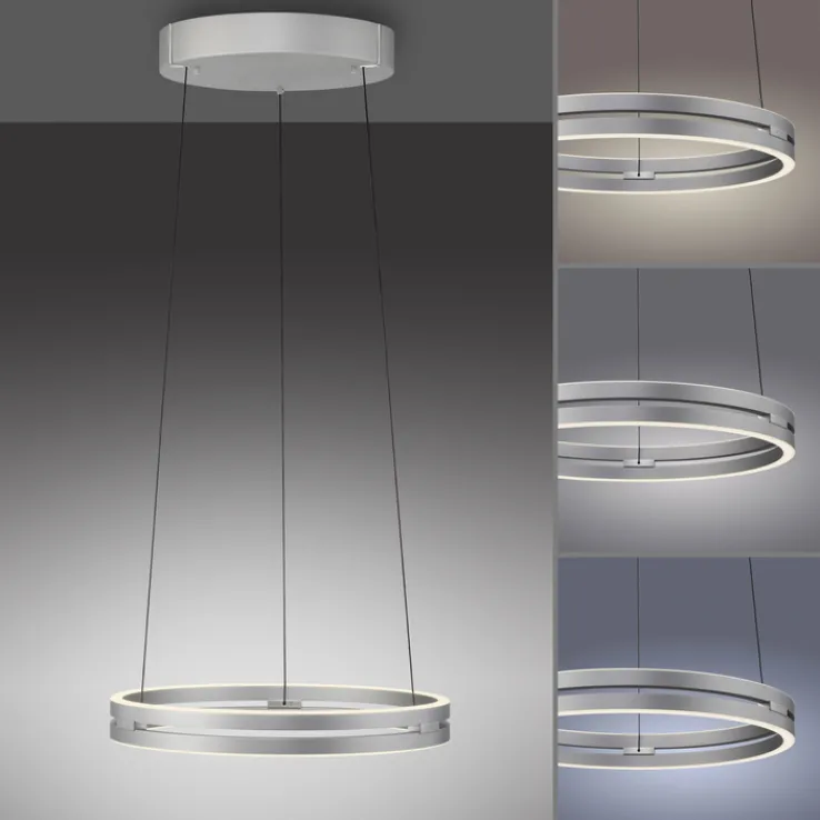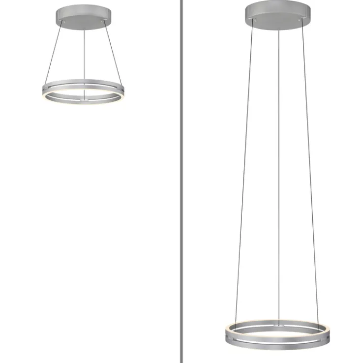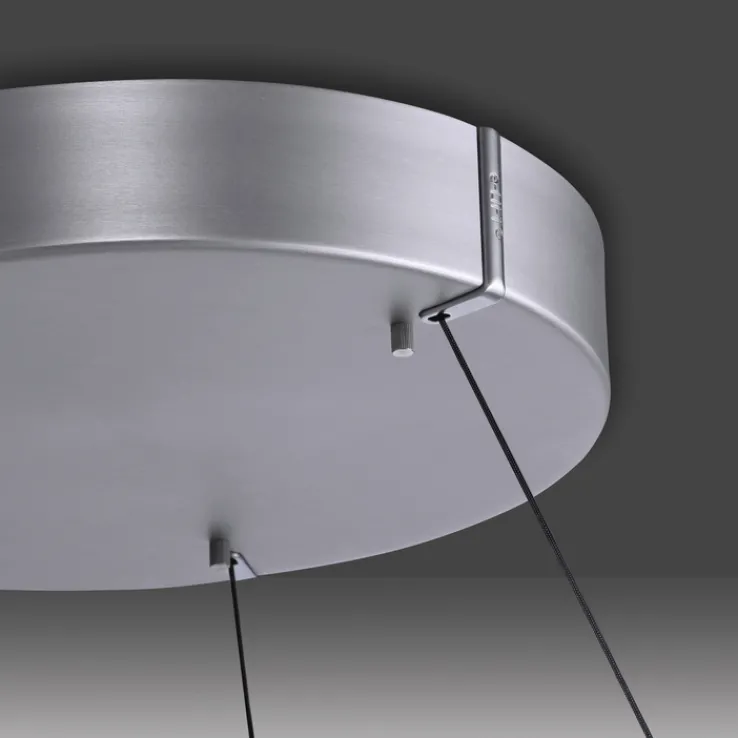 Die LED Pendelleuchte PURE E-LOOP zeichnet sich durch ihr modernes, rundes Design mit klarer Linienführung aus. Sie besteht aus Aluminium in einer alu- bzw. nickelfarbigen Ausführung und zeigt eine glatte, matte Oberfläche. Der Leuchtenkörper ist kreisförmig gestaltet und wird von feinen Stahlseilen gehalten, die eine höhenverstellbare Montage zwischen 40 und 350 cm ermöglichen. Mit einem Durchmesser von 50 cm und einem Gewicht von 7,15 kg eignet sich diese Leuchte für verschiedene Wohnbereiche, darunter Wohn-, Ess- und Schlafzimmer, Arbeitszimmer sowie Küche und Kinderzimmer.
