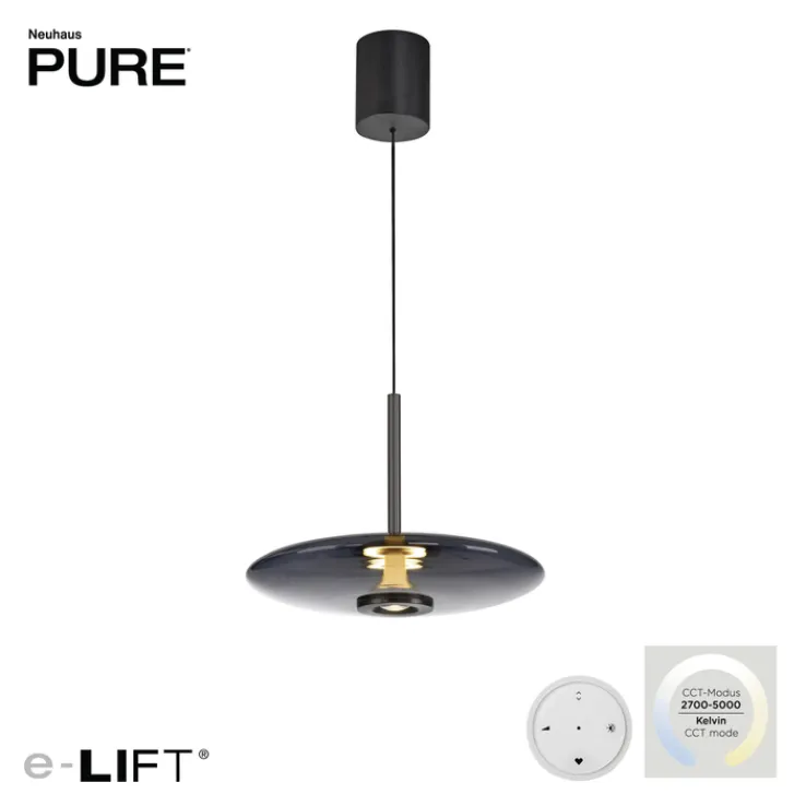 Mit der LED Pendelleuchte PURE E-VITRUM ist der Marke Paul Neuhaus ein Design gelungen, dass sich klassisch-modern und zukunftsweisend gibt. Im Rauchglas-Lampenschirm befinden sich zwei LEDs, eine mit 8 Watt und eine mit 10 Watt. Sie geben ringsherum ein dezentes Licht ab und richten einen Spot direkt nach unten. Die Helligkeit von insgesamt maximal 1.900 Lumen ist dimmbar und die Lichtfarbe von Warmweiß bis Neutralweiß (2.700 – 5.000 Kelvin) justierbar. Die Einstellungen werden einschließlich der Electric-Drive-Höhenverstellbarkeit über eine komfortable Fernbedienung vorgenommen, die zudem eine Memory-Funktion bietet.