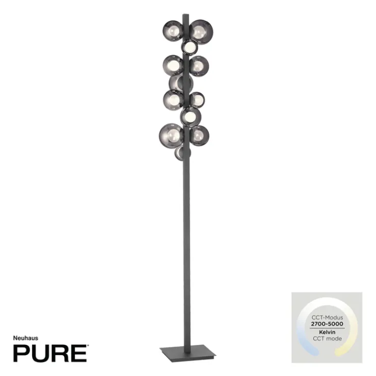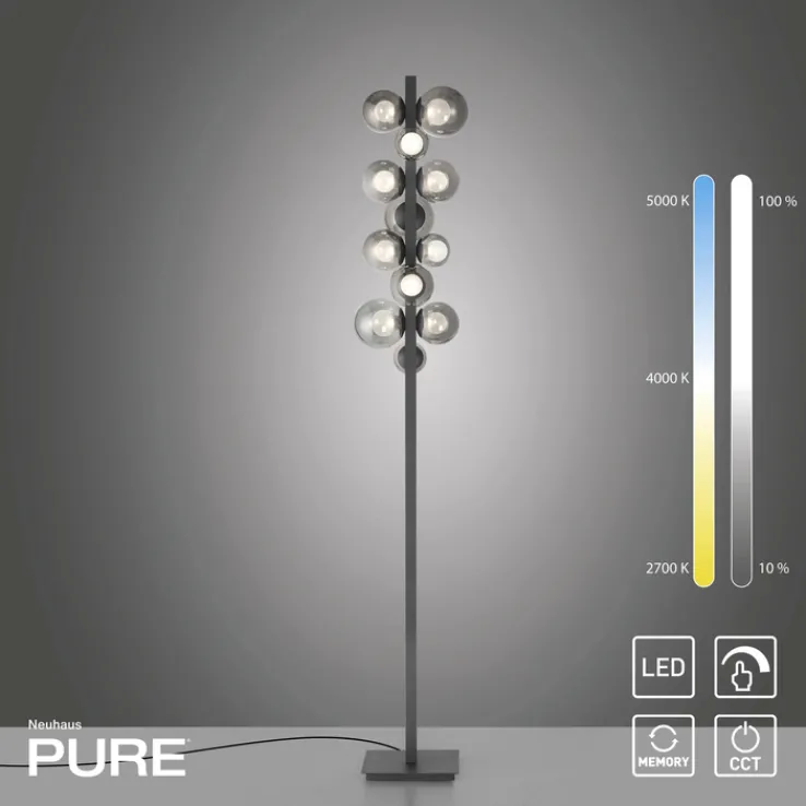 Das deutsche Design der LED Stehlampe PURE POPUP von Paul Neuhaus ist ebenso klassisch wie modern. Zudem sorgt der 12-flammige Aufbau für eine glanzvolle Erscheinung. Die 12 fest eingebauten LED-Leuchtmittel mit jeweils 2,4 Watt befinden sich in Kugeln aus hochwertigem Rauchglas. Zusammen bringen sie es auf eine Leistung von 28 Watt sowie eine dimmbare Helligkeit von bis zu 3.456 Lumen. Als weitere Besonderheit ist die Farbtemperatur der LEDs zwischen 2.700 und 5.000 Kelvin beziehungsweise von Warmweiß bis Neutralweiß einstellbar.