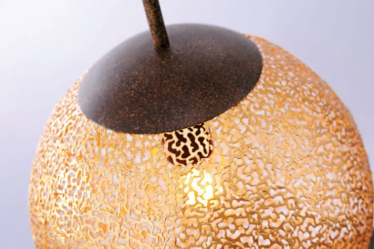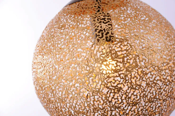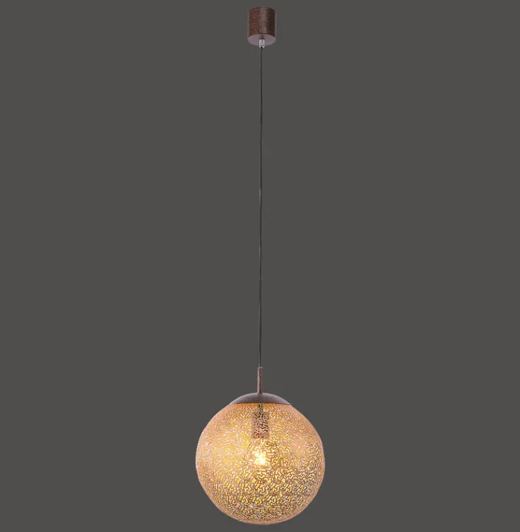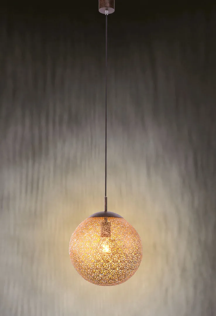 Die hübsche Pendellampe GRETA wirft durch die lichtdurchlässige, offene Oberfläche der circa dreißig Zentimeter im Durchmesser großen, goldfarbigen Lichtkugel ein dekoratives Muster an Wand und Decke. Diese rostfarbige Pendellampe GRETA in goldfarbiger Kugelform passt hervorragend zu Einrichtungen im Landhaus Stil.