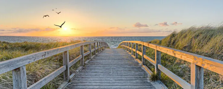 Gefertigt aus hochwertigem Glas, bietet das Wandbild nicht nur eine klare und lebendige Darstellung, sondern auch eine langlebige Qualität. Das Gewicht von 8,48 kg sorgt für eine stabile Anbringung an der Wand. Die Szene zeigt einen hölzernen Steg, der zu einem ruhigen Meer führt, während Vögel im Himmel fliegen, was dem Bild eine dynamische und zugleich entspannende Wirkung verleiht. Dieses Kunstwerk ist perfekt für alle, die eine Verbindung zur Natur und zur Küste suchen und ihrem Zuhause einen Hauch von Ruhe und Gelassenheit verleihen möchten.