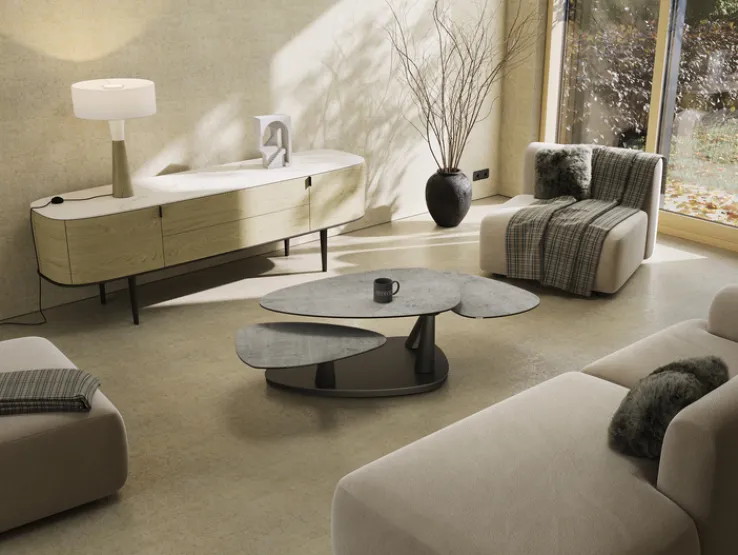 Der Couchtisch aus der Serie CAMELIAS besticht durch sein modernes Design und die Kombination aus hochwertigen Materialien. Die Tischplatte besteht aus einer Mischung aus Glas und Keramik, die in einem eleganten Grauton gehalten ist. Die Oberfläche zeigt eine feine, steinartige Textur, die dem Tisch eine besondere Note verleiht. Die Tischbeine aus schwarzem Stahl sorgen für Stabilität und fügen sich harmonisch in das Gesamtbild ein.