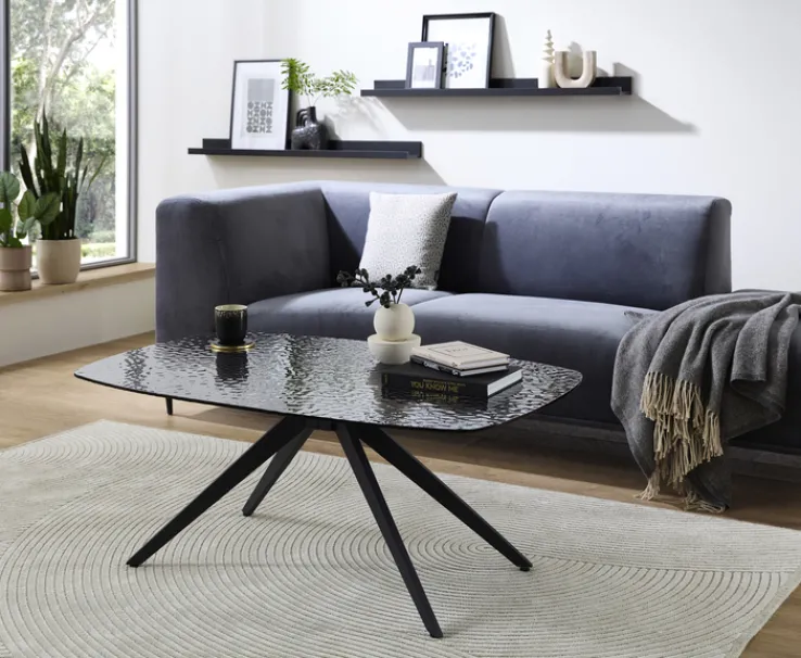 Der moderne ELIAS Couchtisch schafft auf 110 x 70 cm viel praktische Abstellfläche vor dem Sofa oder der heimischen großen Wohnlandschaft. Die schwarzen Standbeine wurden pulverbeschichtet und spreizen nach außen hin ab, was frontal für zusätzliche Beinfreiheit vor dem Sofa sorgt – ebenso wie für eine moderne und stilvolle Raumwirkung.
