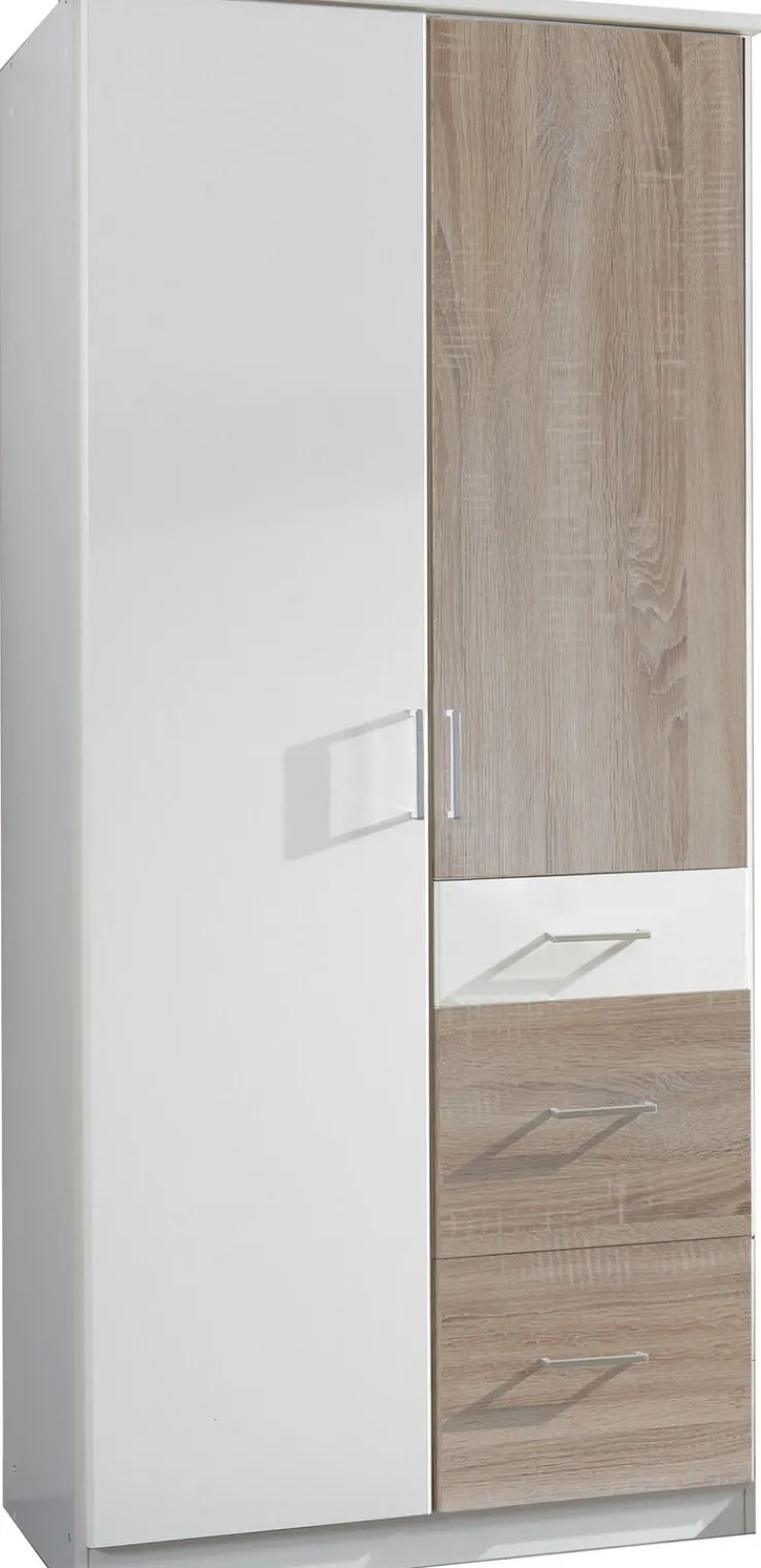 Der Drehtürenschrank aus der Serie „CLICK“ vereint modernes Design mit praktischer Funktionalität. Mit einer Breite von 90 cm, einer Höhe von 199 cm und einer Tiefe von 58 cm bietet er großzügigen Stauraum. Der Schrank verfügt über zwei Drehtüren und drei Schubkästen, die ausreichend Platz für Kleidung und andere Gegenstände bieten. Die Kombination aus alpinweißem und sägerauem Eiche-Dekor verleiht dem Schrank eine elegante und zeitlose Optik, die sich nahtlos in verschiedene Einrichtungsstile einfügt.