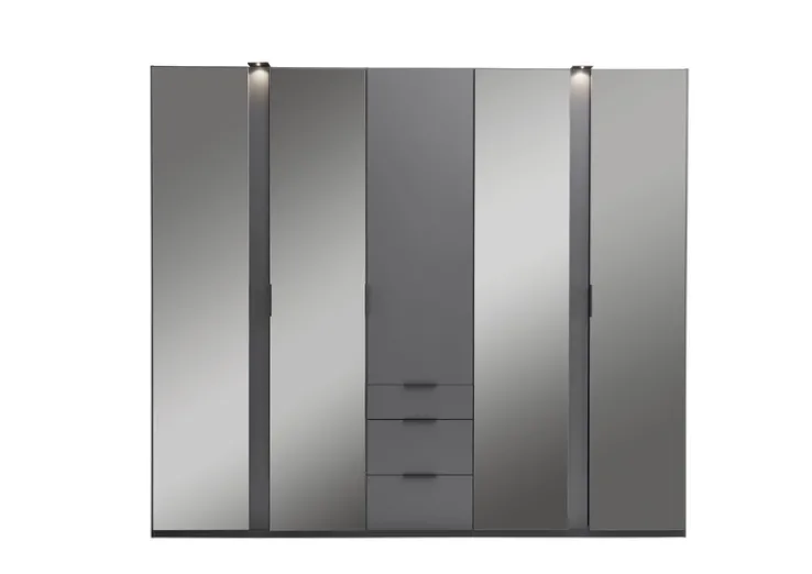 Der Drehtürenschrank aus der Serie LA RIOJA bietet eine moderne und funktionale Lösung für Ihr Schlafzimmer. Mit einer Breite von 250 cm, einer Höhe von 216 cm und einer Tiefe von 58 cm bietet er großzügigen Stauraum. Der Schrank ist in einem eleganten Graphitfarbton gehalten, der durch die Kombination von Holznachbildung und Spiegelglas eine stilvolle Optik erhält. Die fünf Drehtüren, von denen einige mit Spiegelglas versehen sind, verleihen dem Raum eine offene und helle Atmosphäre.