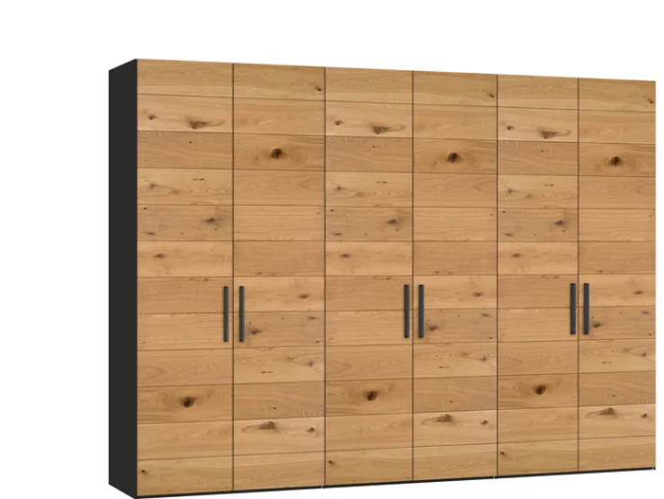 Der Drehtürenschrank aus der Serie Longline VI besticht durch sein modernes Design und bietet großzügigen Stauraum. Mit einer Breite von 303,1 cm, einer Höhe von 220 cm und einer Tiefe von 59 cm fügt er sich nahtlos in größere Räume ein. Die sechs Drehtüren sind in einem ansprechenden Novaschwarz mit Wildeichenfurnier in Bretteroptik gehalten, was dem Schrank eine natürliche und zugleich elegante Ausstrahlung verleiht. Die Kombination aus schwarzem Korpus und der warmen Eichenoptik der Türen schafft einen harmonischen Kontrast, der in jedem Raum Akzente setzt.
