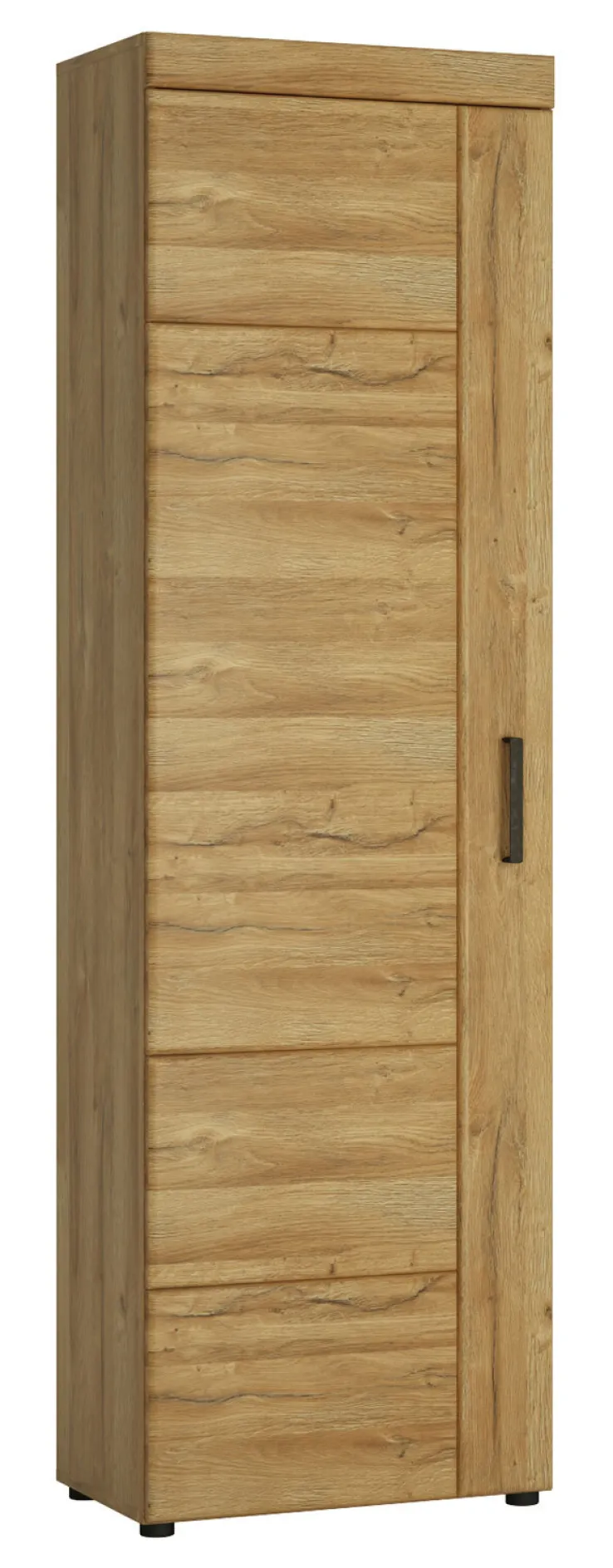 Dieser Garderobenschrank ist ein richtiges Ordnungswunder! De Schrank CORTINA in Holznachbildung Eiche braun ist 58 x 195 cm groß und hat eine Tiefe von 37,5 cm. Er ist mit einer Drehtür ausgestattet und sehr geräumig.