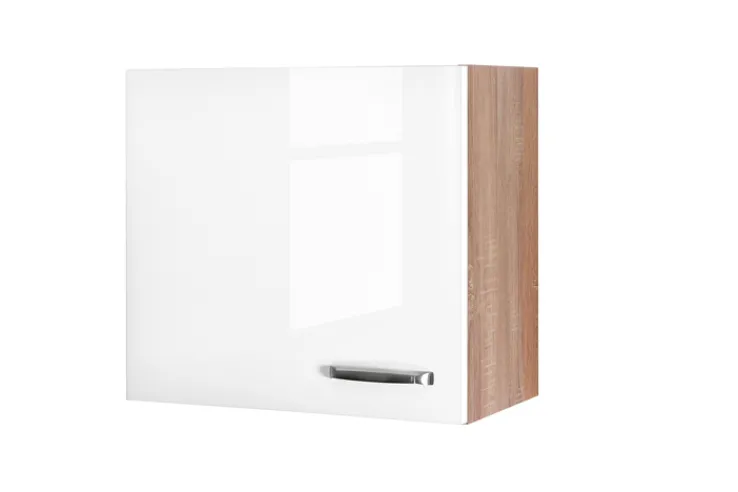 Der Hängeschrank LUKE mit den Ma0en 60 x 54 x 32 cm ist aus Holznachbildung gefertigt und kombiniert den eichefarbenen Korpus mit einer lackierten Front in Hochglanz Weiß. Mit seinem modernen Look verleiht er der Küche ein stilvolles und freundliches Ambiente. Die angesagte Optik wird von chromfarbigen Griffen unterstrichen. Hinter der Drehtür ist der Hängeschrank mit einem Einlegeboden ausgestattet. Geschirr, Tassen und Gläser lassen sich damit übersichtlich und jederzeit griffbereit anordnen.