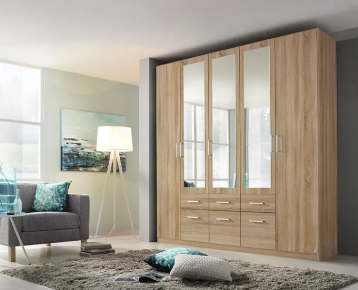 Die solide Grundkonstruktion des QUARTIER Kleiderschranks BINGEN besteht aus Holznachbildung und wird durch hochwertige Elemente aus Glas und Metall ergänzt. Das natürlich wirkende Dekor Sonoma Eiche lässt sich harmonisch in viele Einrichtungsstile integrieren. Zusätzlich zu den 5 großen Drehtüren verfügt dieser Schrank über 6 geräumige Schubkästen. Da die Front beim QUARTIER Kleiderschrank BINGEN mit Spiegeln an den 3 mittleren Drehtüren besetzt ist, eignet sich der Schrank auch für eine optische Weitung des vorhandenen Raums.