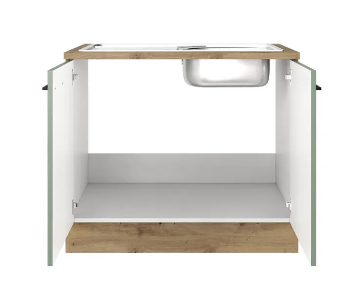 Der Spülenschrank vereint Funktionalität und modernes Design. Mit einer Breite von 100 cm, einer Höhe von 85 cm und einer Tiefe von 60 cm bietet er ausreichend Stauraum für Ihre Küchenutensilien. Die zwei Drehtüren sind in einem ansprechenden Schilfgrün gehalten, das in Kombination mit dem Artisan Eiche Dekor einen natürlichen und zeitgemäßen Look verleiht. Die klaren Linien und die schlichten schwarzen Griffe unterstreichen das minimalistische Design. Gefertigt aus einer robusten Holznachbildung und mit einer Melaminharzbeschichtung versehen, ist der Schrank sowohl langlebig als auch pflegeleicht. Die Spanplatte sorgt für Stabilität und Widerstandsfähigkeit im täglichen Gebrauch. Dieser Spülenschrank ist eine praktische Ergänzung für jede Küche, die Wert auf Stil und Funktionalität legt.
