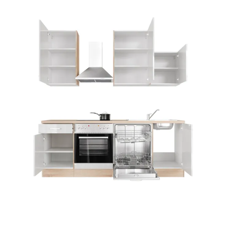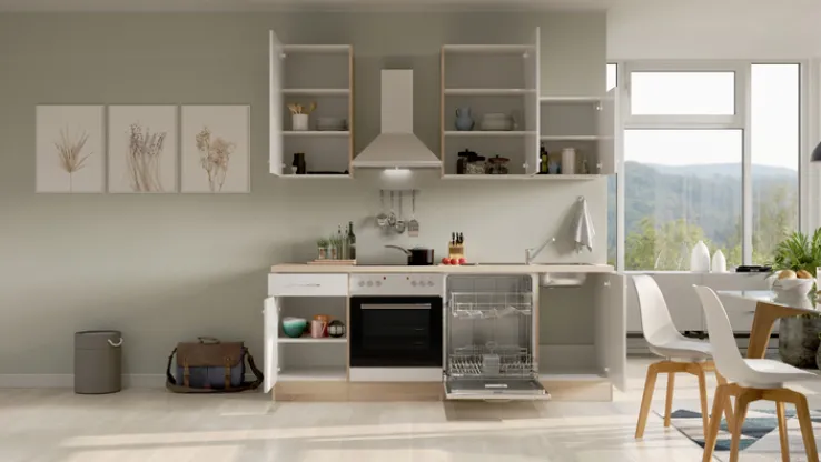 Ausgestattet ist die Küchenzeile mit allen wichtigen Elektrogeräten: Ein Backofen, ein Geschirrspüler und eine Dunstesse sind bereits im Lieferumfang enthalten und machen die Küche sofort einsatzbereit. Durch ihre klaren Linien und die moderne Farbgebung passt die LUKE perfekt in verschiedenste Wohnstile – ob in einer Stadtwohnung, einem Single-Apartment oder als stilvolle Zweitküche.
