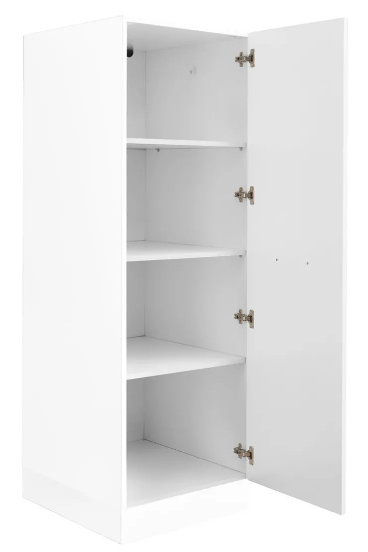 Dieser Schrank hat eine Breite von 50 cm, eine Höhe von 162 cm sowie eine Tiefe von 67,5 cm auf. Er ist mit Füßen ausgestattet, die höhenverstellbar sind und besitzt eine Tür, hinter der sich insgesamt drei Einlegeböden befinden. Somit bietet er nicht nur viel Stauraum, sondern die Dinge lassen sich innerhalb des Schrankes auch noch einmal aufteilen, was für zusätzliche Ordnung sorgt. Damit die Tür sich einfach öffnen beziehungsweise schließen lässt, beherbergt sie einen Metallgriff; damit das Ganze leise von sich geht, wurde der Schrank mit einer Soft-Close-Funktion versehen.