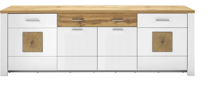 Das Lowboard aus der Serie RAMIRA vereint modernes Design mit klassischer Eleganz. Mit einer Breite von 220 cm, einer Höhe von 74 cm und einer Tiefe von 46 cm bietet es großzügigen Stauraum. Die Hauptfarbe ist Weiß, ergänzt durch braune und eichefarbene Dekorelemente. Die Fronten sind in einem Supermatt-Weiß gehalten, während die Oberflächen in Altholz- und Hirnholz-Dekor gestaltet sind, was dem Möbelstück eine natürliche und warme Ausstrahlung verleiht.