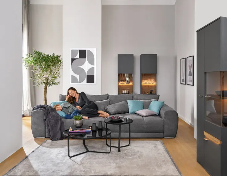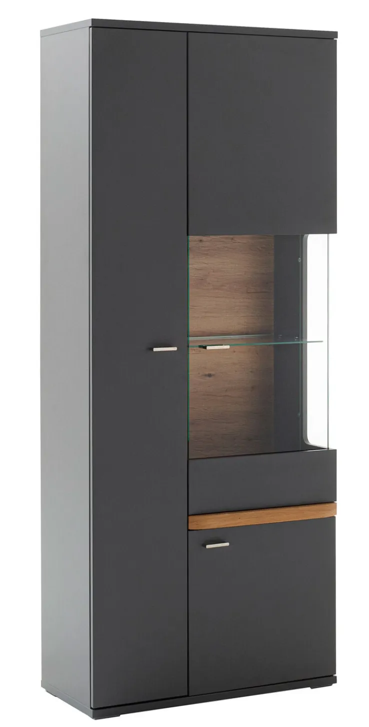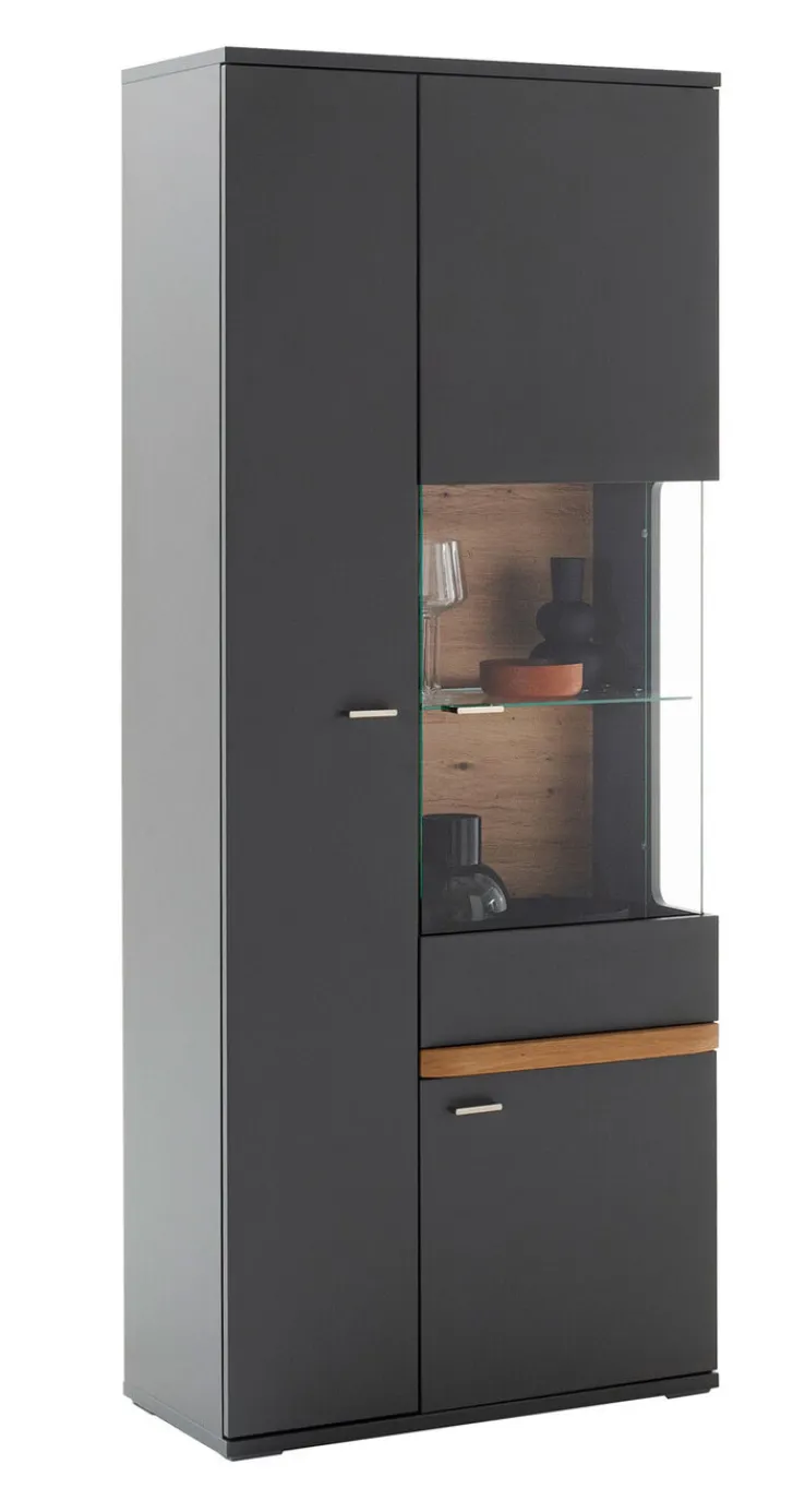 Die graue Vitrine CHARLOTTE mit einer Breite von 80 cm besticht mit einem modernen Design und bietet viel Stauraum. Durch die in Balkeneiche abgesetzte Rückwand strahlt sie trotz stylischem Look Natürlichkeit aus.