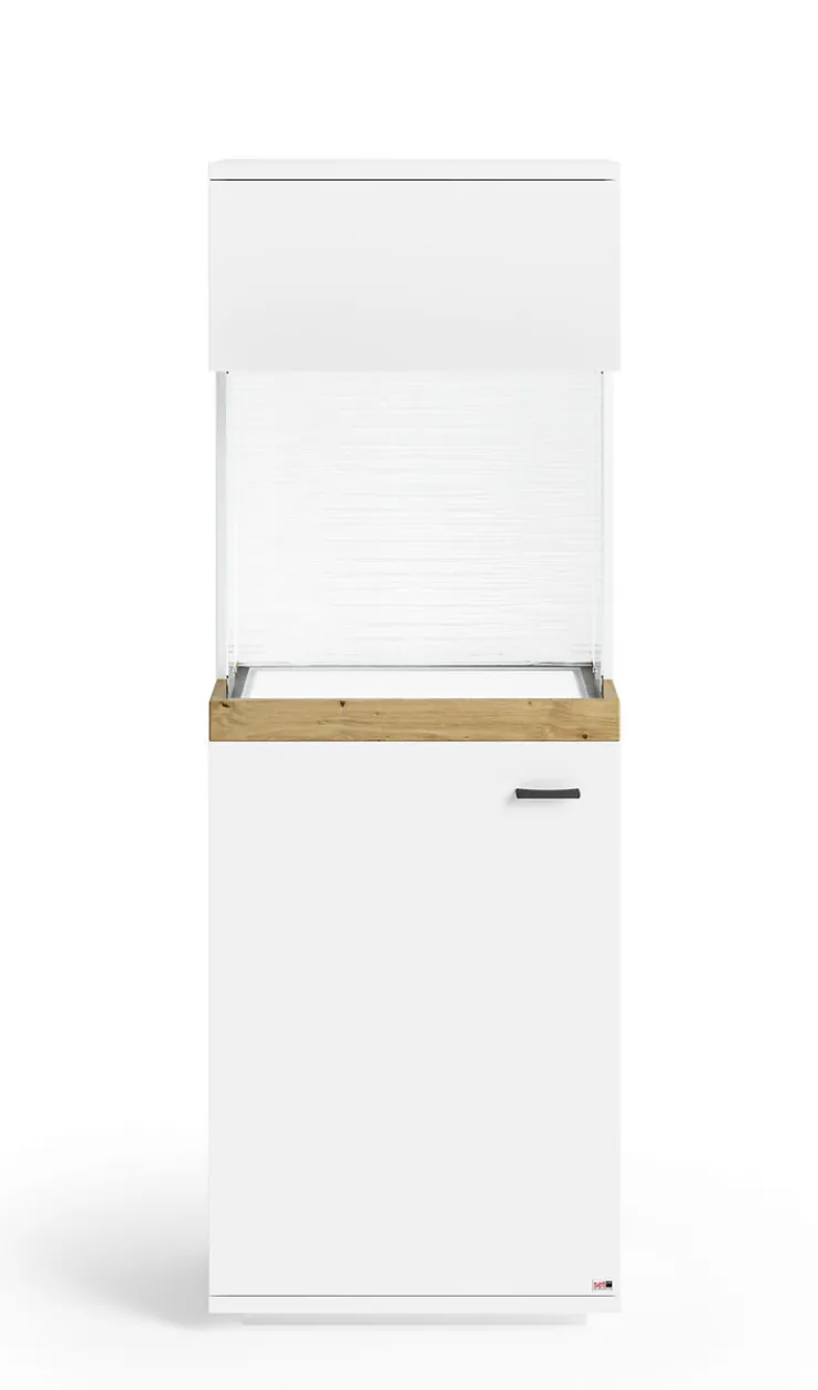 Vitrine LANCASTER I ist aus Holznachbildung gefertigt und überwiegend in Weiß gehalten. Ein abgesetztes Element im Farbton Eiche Artisan sorgt für einen angenehmen Kontrast. Der Vitrinenteil im oberen Bereich lässt sich mit der durchgehenden Tür mit Glaselement öffnen und bestücken. Für die stilgerechte Ausleuchtung sorgt ein integriertes Beleuchtungselement. Die elegante Vitrine harmoniert besonders gut mit modernen Einrichtungsstilen.