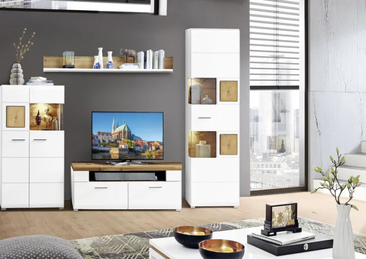 Die 4-teilige Wohnwand FUN PLUS in Eiche/ Weiß verleiht dem Wohnzimmer mit ihrem modernen Look ein gemütliches Ambiente zum Wohlfühlen und bietet zudem jede Menge Stauraum.