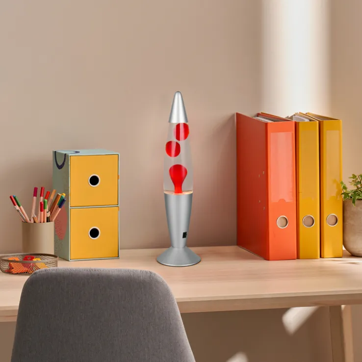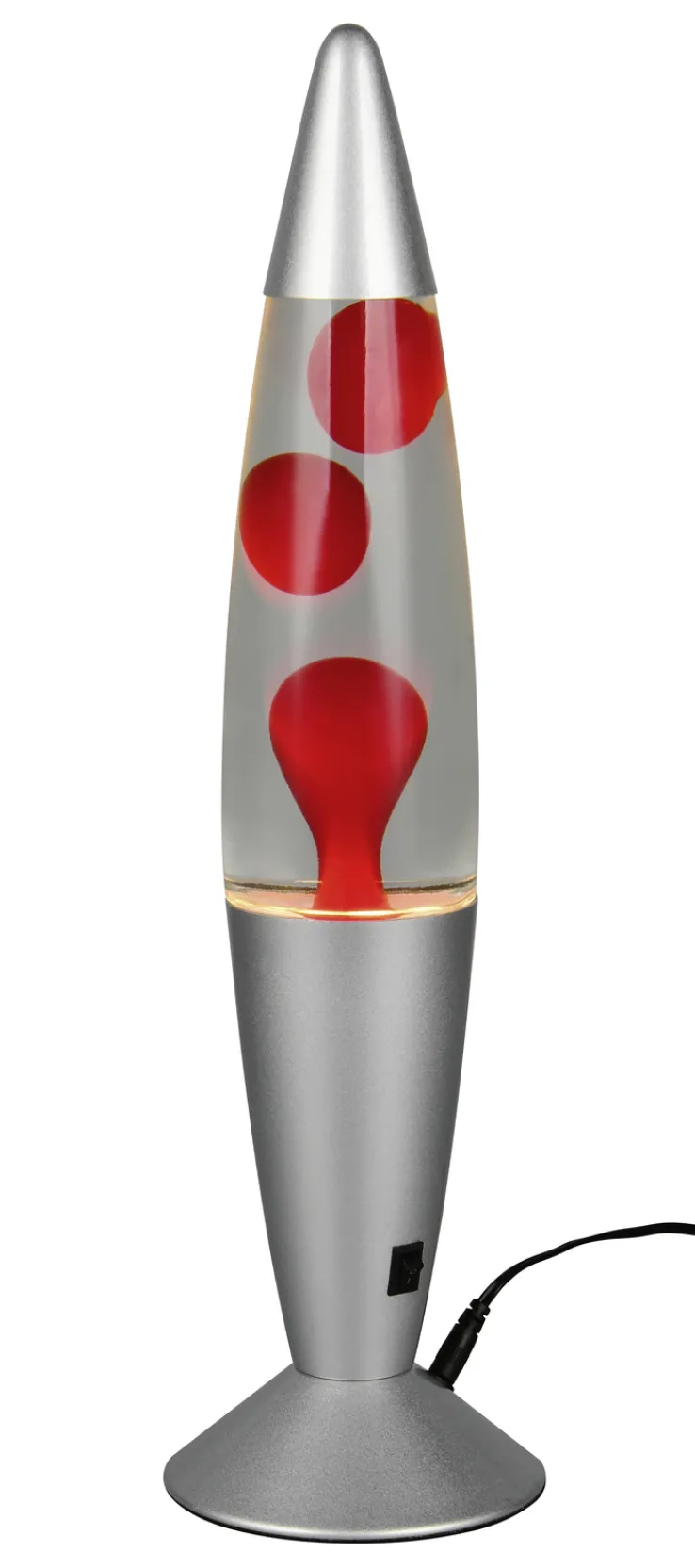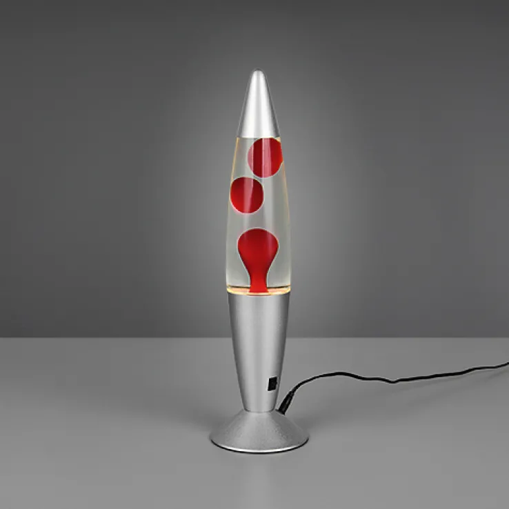 Die Lavalampe der Serie VESUV von Reality RL vereint Retro-Charme mit moderner Technik. Mit einem Durchmesser von 10 cm und einer Höhe von 42 cm ist sie ein stilvolles Accessoire für jedes Zuhause. Die konische Form und der Tellerfuß aus Metall in Alu-/Nickelfarbe verleihen der Lampe ein elegantes Aussehen. Das klare Glasgehäuse enthält rote Wachselemente, die in der transparenten Flüssigkeit faszinierende Muster bilden.