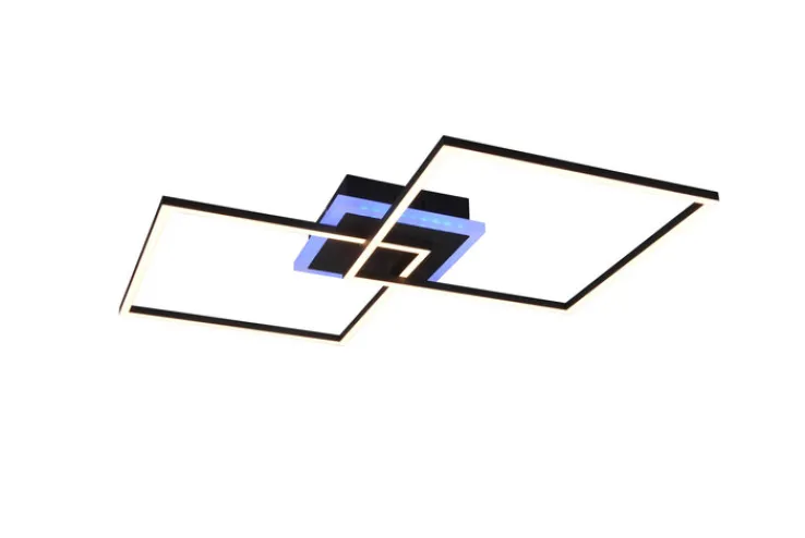Die schwarze LED-Deckenlampe ARRIBO aus der Kollektion von Reality RL besticht besonders durch ihr modernes, geometrisches Design. Die 2-flammige Leuchte aus Metall ist dimmbar und mit einem Farbwechsler RGB sowie einer Fernbedienung ausgestattet.