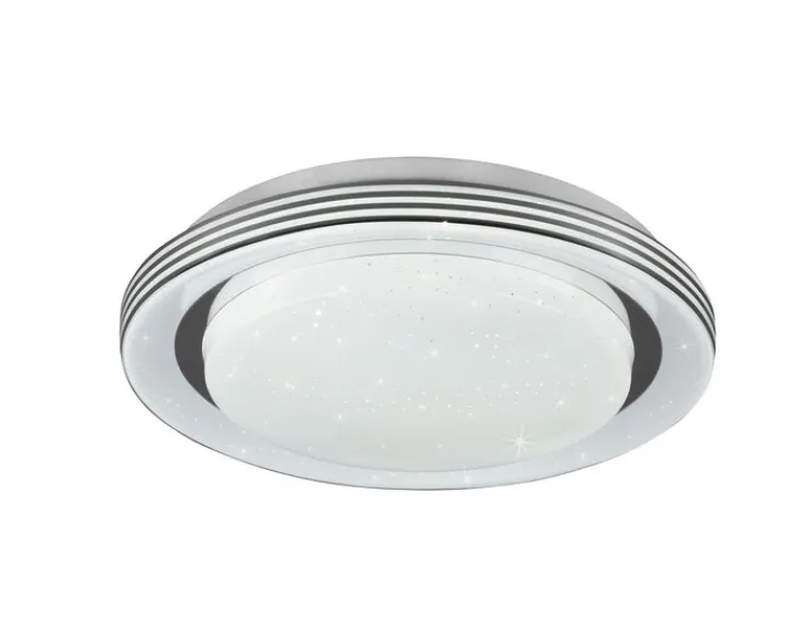 Deckenlampe mit Wow-Effekt! Wenn es dunkel wird, zeigt die ATRIA, was sie kann. Auf Knopfdruck erstrahlt ihr Starlight-Cover wie ein funkelnder Sternenhimmel. Ob warmweißes oder eher erfrischendes Licht gewünscht wird, lässt sich bequem vom Sofa aus per Fernbedienung einstellen. Das handliche Gerät enthält auch eine Funktion zum stufenlosen Dimmen.