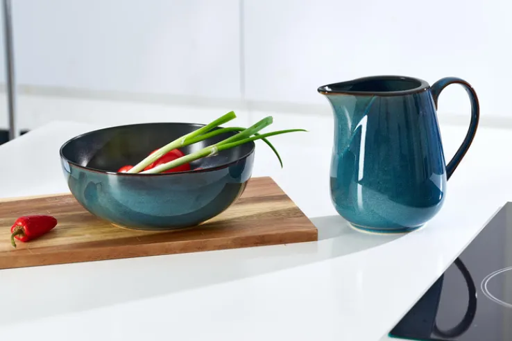 Der Ritzenhoff & Breker Krug BALI besitzt ein Volumen von 1,2 Litern. Er besteht aus blauem Steinzeug und besitzt eine Reaktivglasur. Er darf in die Mikrowelle und ebenso in die Spülmaschine gestellt werden.