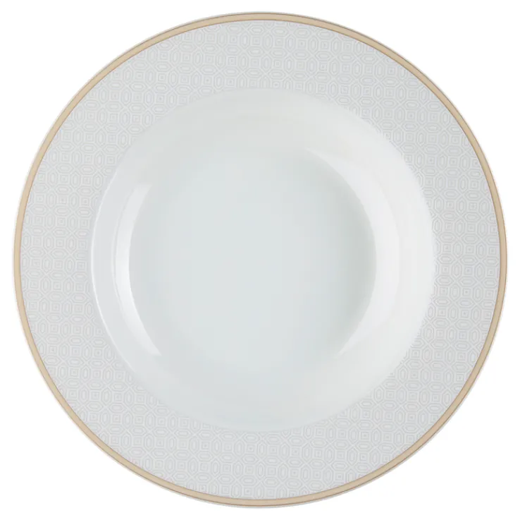 Fast noch dezenter sind beim GEO Suppenteller aus Porzellan von Ritzenhoff & Breker die Tellerränder gehalten: An die filigrane goldene Linie reiht sich nämlich ein sehr dezentes und kleinmaschiges Muster, das dem Suppenteller weitere optische Tiefe verleiht. Der Teller besitzt einen Durchmesser von 21,5 cm und eine Höhe von 3 cm, was ihn für jede Suppe zu einer Top-Wahl avancieren lässt.