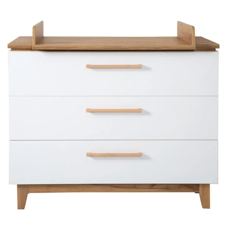 Der Korpus und die Fronten der Wickelkommode bestehen aus stabilen Spanplatten. Die Oberflächen sind weiß lackiert. Die Deckplatte, der Wickelaufsatz und die Rahmensockel der Kommode sind aus HDF-Platten gefertigt und im Dekor Goldeiche beschichtet. Das verwendete Melaminharz ist stoß- und kratzfest. Der Wickelaufsatz ist individuell montierbar. Die Schubkästen sind mit einem Soft-Close-System ausgestattet. An den Fronten befinden sich Bügelgriffe aus lackiertem Massivholz.