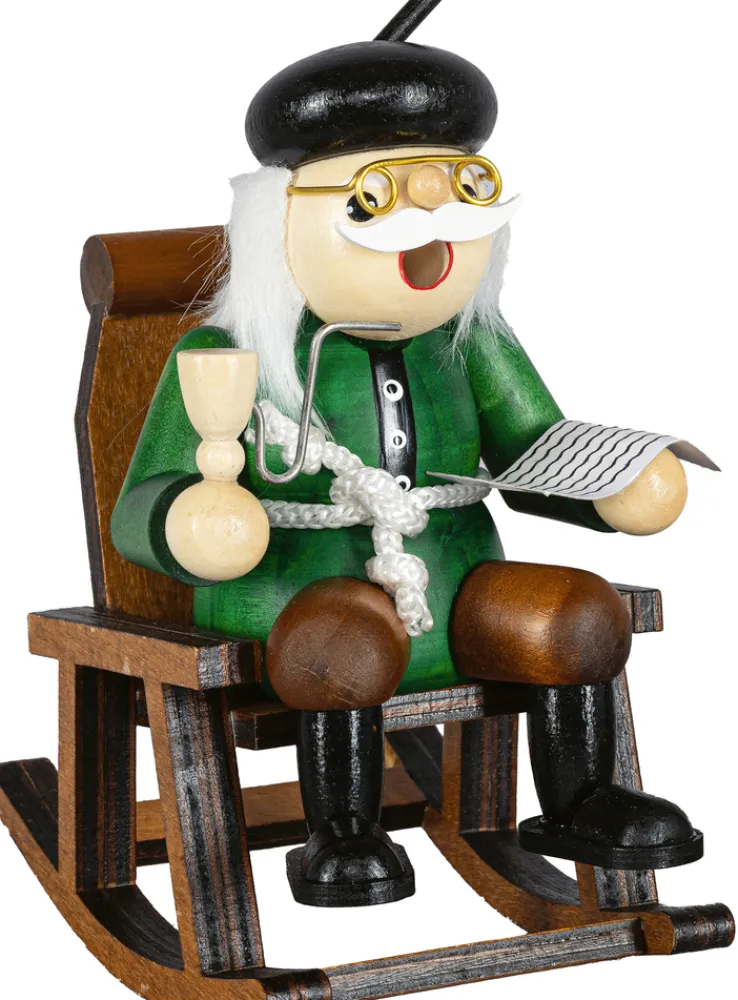 Diese Dekofigur aus der Serie OPA M. SCHAUKELSTUHL ist aus Holz gefertigt und zeigt einen Opa auf einem Schaukelstuhl. Die Maße betragen 16 cm in der Tiefe, 13,5 cm in der Breite und 8,5 cm in der Höhe. Durch die mehrfarbige Gestaltung entsteht ein lebendiges Erscheinungsbild mit sichtbaren Details in verschiedenen Farbtönen.