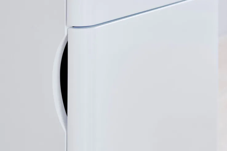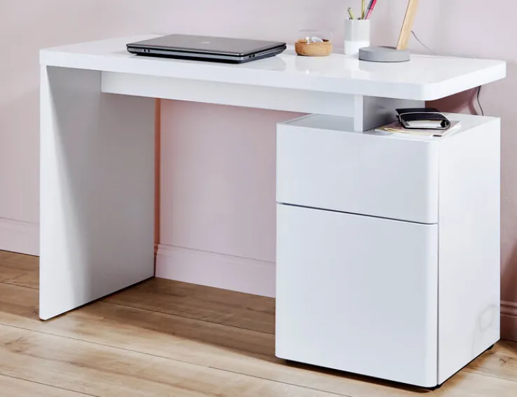 Die dicke Oberplatte des Schreibtisches, das Grundgestell, sowie der Korpus sind optisch ansprechend mit Holzfurnier in der Variante Weiß Hochglanz gestaltet. Eine praktische