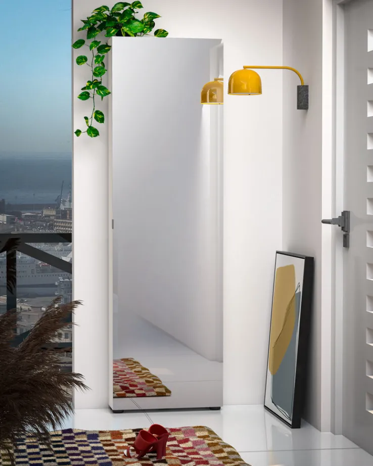 Dieser Schuhschrank verfügt über 10 Einlegeböden und hat eine Tiefe von 19 cm. Er ist mit einer Drehtür ausgestattet, sodass die Schuhe vor Staub geschützt sind. Da die Tür einen Spiegel hat, wirkt der Raum größer; zudem sorgt der Spiegel auch dafür, dass man vor dem Verlassen der Wohnung noch einmal kontrollieren kann, ob die Kleidung perfekt sitzt. Zudem punktet der Schrank damit, dass die Tür über eine Dämpfung verfügt.