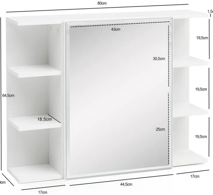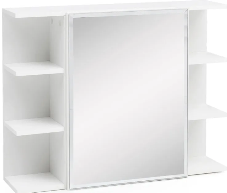 Der 80 x 65 cm große Spiegelschrank in Weiß schafft Platz im Bad und überzeugt durch sein zeitlos schönes Design. Hinter der Spiegeltür befinden sich zwei große Fächer, zusätzlich sind rechts und links jeweils drei offene Fächer angebracht.