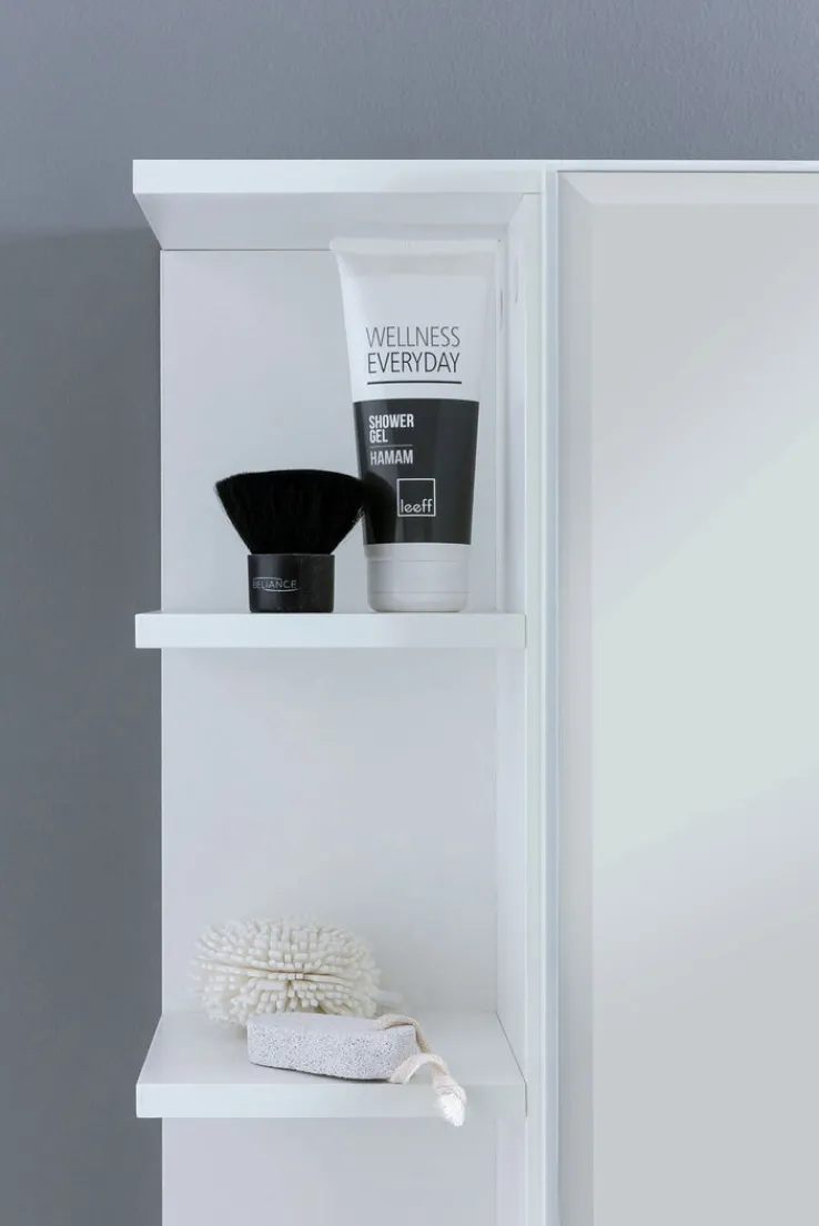 Über dem Waschbecken im Badezimmer oder Gäste-WC angebracht ist der Spiegelschrank eine unentbehrliche Unterstützung beim Schminken, Rasieren und Frisieren. Die zahlreichen Ablageflächen eignen sich zur Lagerung von Bad-Utensilien. In den beiden Fächern hinter der Spiegeltür lassen sich Make-up & Co. spritzwassergeschützt unterbringen. Die offenen Fächer bieten einen schnellen Zugang zu Accessoires, die häufig benötigt werden. Sie können auch als Dekofläche für eine gemütliche Badgestaltung genutzt werden.