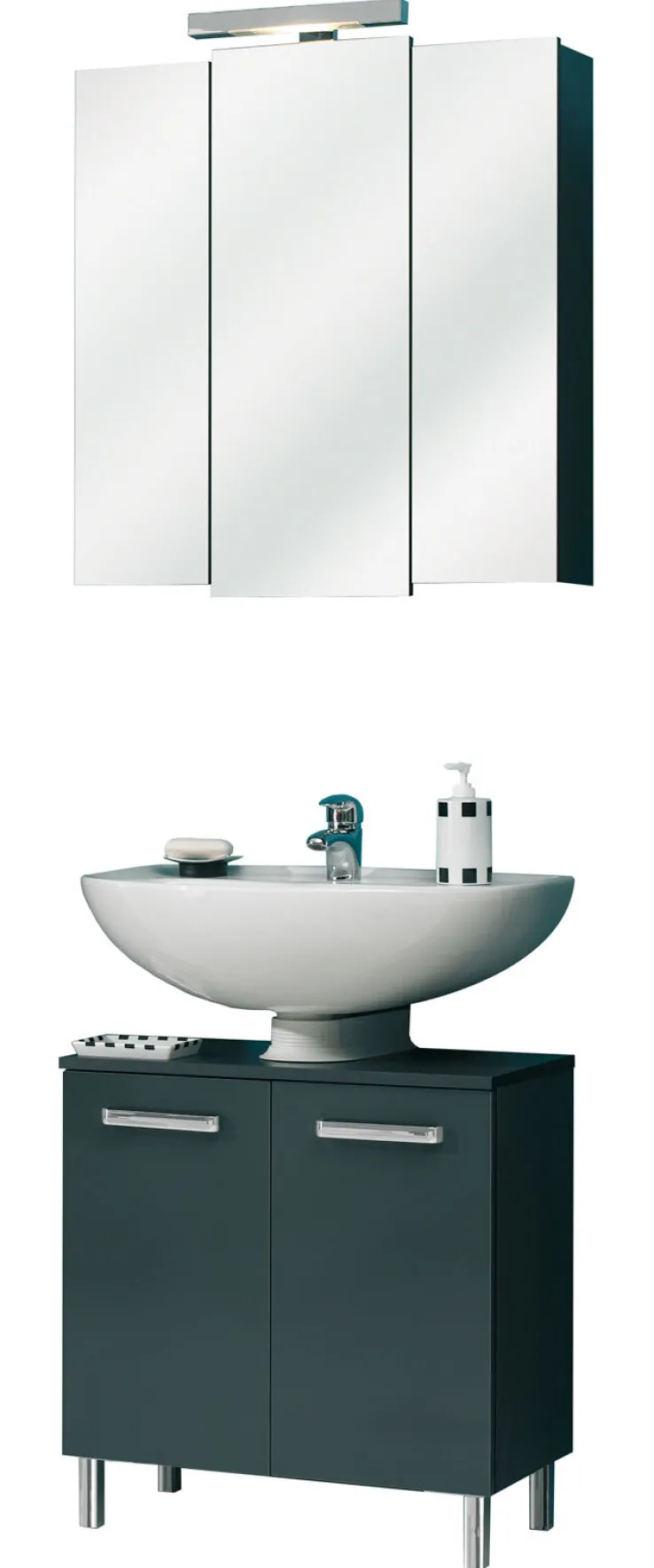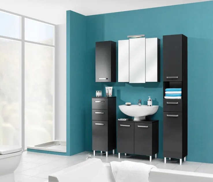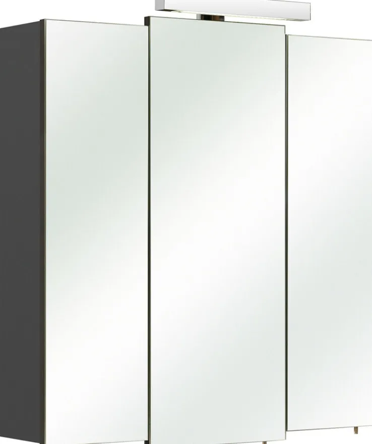 Durch seine schlichte Eleganz überzeugt der anthrazitgraue Spiegelschrank LIVORNO I seine Betrachter. Dabei bildet der dunkle Korpus einen edlen Kontrast zu den Spiegelfronten der Türen. Dezent und doch effektiv hebt sich die mittlere Tür durch ihre etwas längere Front hervor. Eine LED Bügelleuchte sorgt jederzeit für optimales Licht. In dem 68 cm x 73 cm x 20 cm großen Hängeschrank verbirgt sich genug Stauraum für die wichtigsten Utensilien.