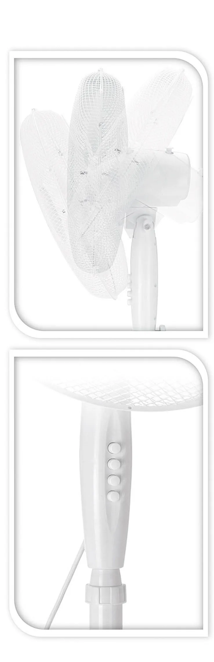 Ein stabiler Kreuz-Fuß aus Metall in Weiß verleiht dem Standventilator BREEZE II auf jedem Fußboden festen Halt. Das darauf befestigte Gestell kann im Bereich zwischen 49 und 120 Zentimetern in der Höhe verstellt werden. Der Ventilator verfügt über drei Rotorblätter hinter einem Gitter-Gehäuse. Den Kopf können Sie bei Bedarf nach oben oder unten neigen. Der Luftstrom kann in drei Geschwindigkeitsstufen geregelt werden. Für den Standventilator BREEZE II ist der Anschluss an 220 V Spannung bei 50-60 Hz erforderlich, die Leistung liegt bei 45 Watt. Er verfügt über eine 150 cm lange Zuleitung. Dank des konstanten und exakt einstellbaren Luftstroms kühlt der Ventilator effektiv und hält Moskitos fern.