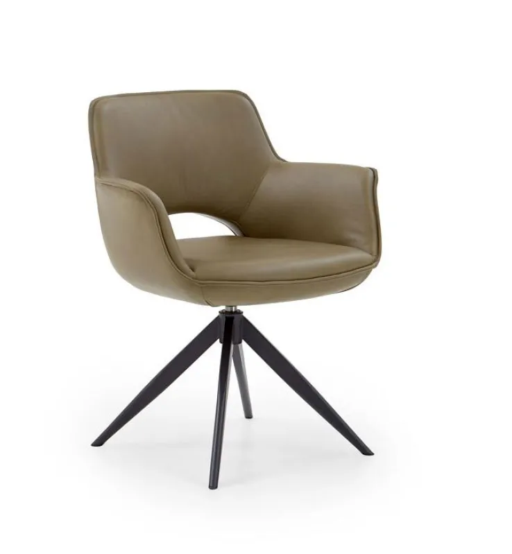 Der Stuhl CHESTER mit Armlehnen mit Leder-Bezug in Moosgrün und schwarzem Vierfußgestell überzeugt mit einem stilvollen Look und sieht im offenen Wohn-Essbereich sowie im Esszimmer gut aus. Gleichzeitig bietet er ein angenehmes Komfortgefühl und lädt zum Sitzenbleiben ein.