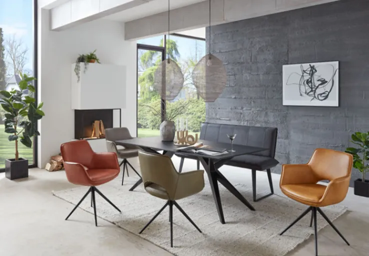 Der gepolsterte Stuhl CHESTER besteht aus hochwertigen Materialien wie Metall und Echtleder und ist dadurch robust und strapazierfähig. Durch den Ausschnitt an der Rückenlehne sieht der Esszimmerstuhl top modern aus und bietet zudem auch bei längerem Sitzen einen hohen Sitzkomfort. Positiv auf den Komfort wirken sich außerdem die Armlehnen auf. Auf diesen lassen sich die Arme nicht nur ablegen, sie unterstützen zudem beim Aufstehen.