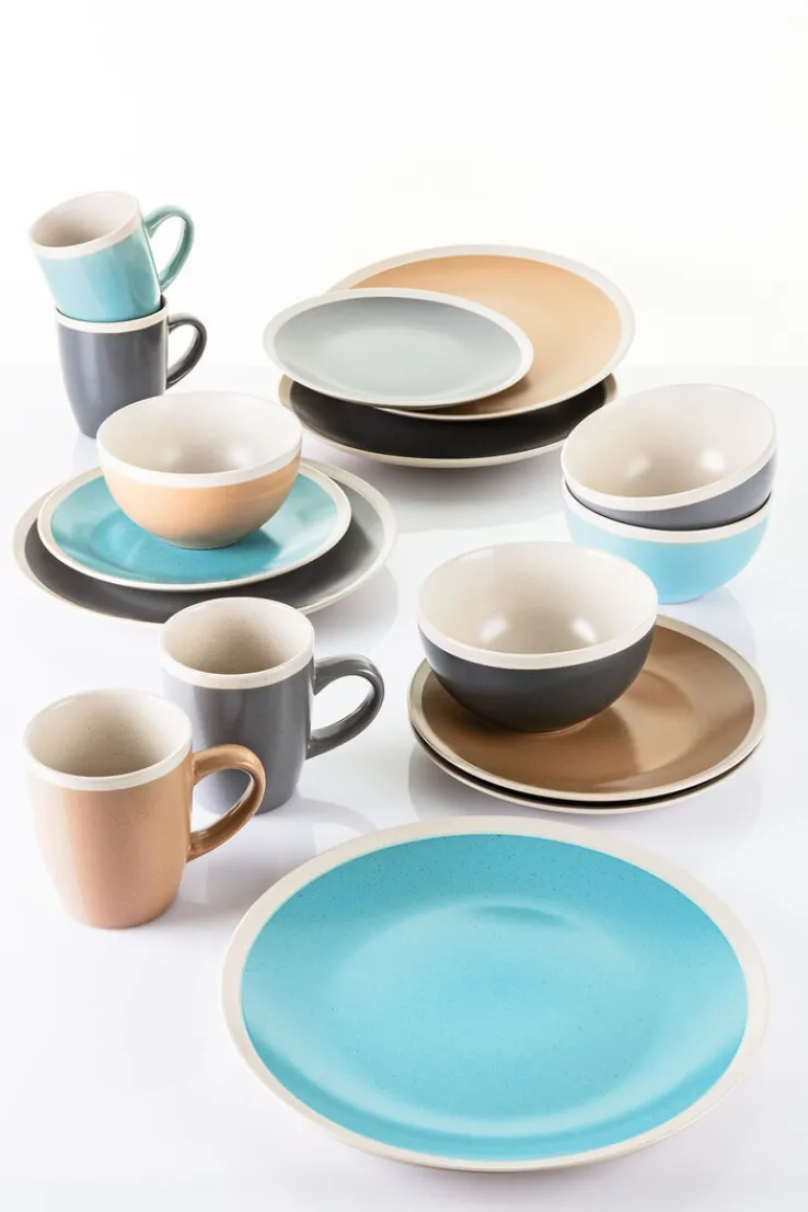 Das TAFELWERT Kombiservice JONE besteht aus vier flachen Tellern mit 27 cm Durchmesser, vier Desserttellern mit einem Durchmesser von 21 cm, vier Schalen mit 15 cm Durchmesser und vier Kaffeebechern mit einem Fassungsvermögen von 300 ml. Hergestellt aus hochwertigem Steinzeug sind die Geschirrteile robust, strapazierfähig und mikrowellengeeignet. Zudem lässt sich das Kombiservice bedenkenlos in der Spülmaschine reinigen. Durch die unterschiedlichen Farben – von Taupe bis Hellblau – ist das Geschirr auch optisch ein Highlight und sorgt für ein modernes Ambiente.