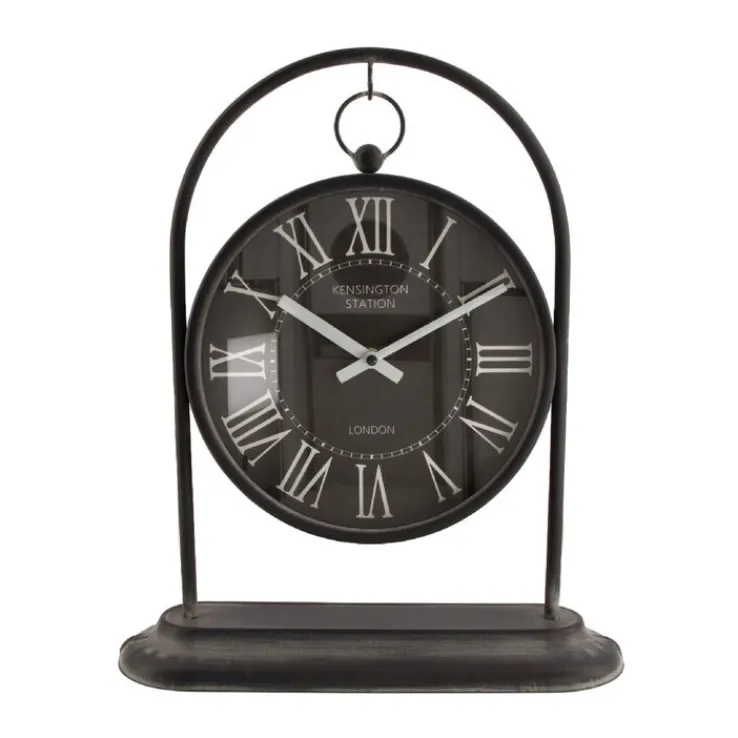 Die Tischuhr besticht mit einem stilvollen Design in Schwarz. Die Uhr selbst wirkt wie in das Gestell aus Eisen eingehängt. Passend dazu ist das Ziffernblatt mit römischen Ziffern ausgestattet. Die batteriebetriebene Tischuhr ist 41 cm hoch.