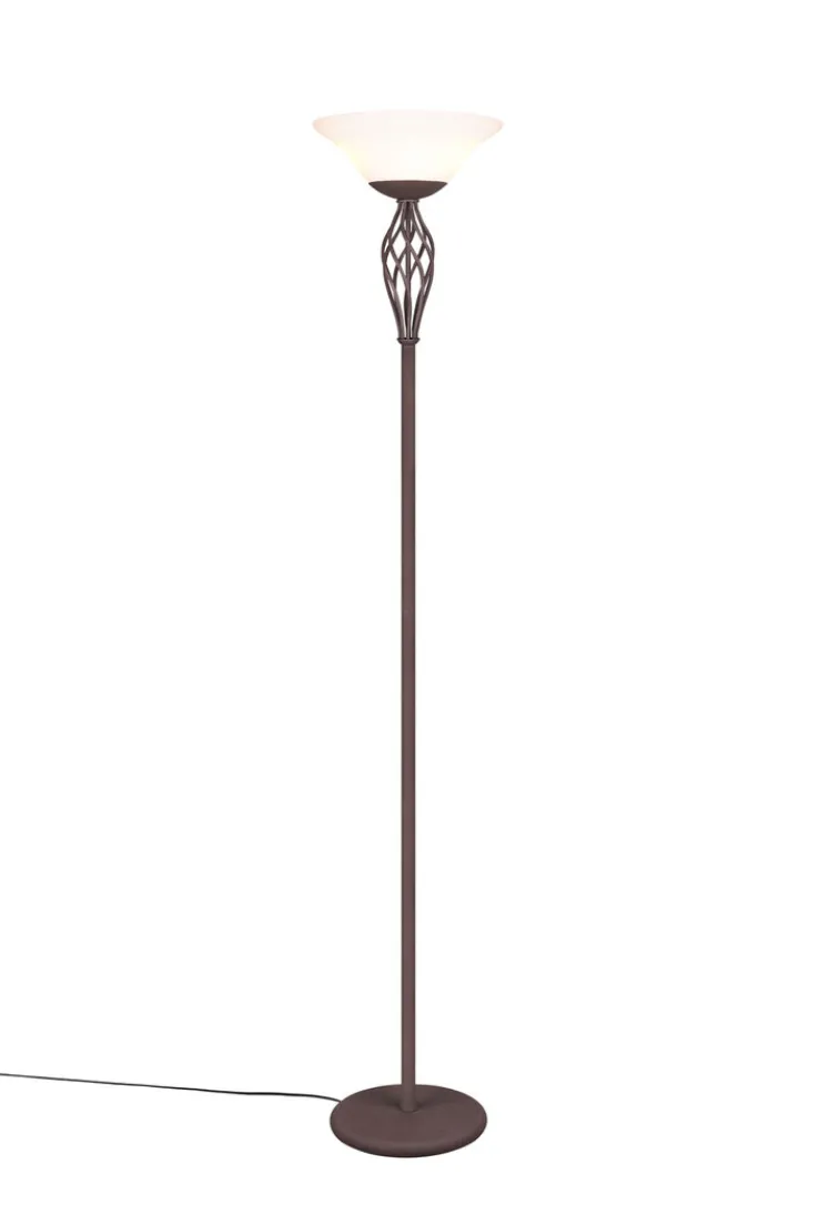 Der Deckenfluter aus der Serie RUSTICA von Trio vereint Funktionalität und ansprechendes Design im Landhausstil. Mit einer Höhe von 180 cm und einem Durchmesser von 33,5 cm fügt sich die Lampe harmonisch in verschiedene Wohnräume ein. Die Hauptfarbe ist ein elegantes Rostbraun, das durch weiße Glaselemente ergänzt wird. Der runde Tellerfuß sorgt für Stabilität und unterstreicht das klassische Design.