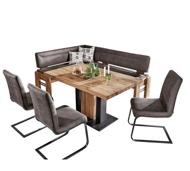Die Eckbank aus massiv geölter Balkeneiche wirkt durch die Holzfüße und dem Microfaser Bezug
