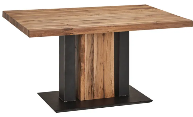 Der Esstisch aus der Serie POPPI zeichnet sich durch eine klare, rechteckige Form und eine massive Tischplatte aus Eiche aus. Die Oberfläche zeigt eine natürliche Maserung in unterschiedlichen Brauntönen, die dem Tisch eine ausdrucksstarke und authentische Optik verleiht. Die Kombination aus Holz und den schwarzen Metallelementen am Gestell sorgt für einen modernen Kontrast und unterstreicht das zeitgemäße Design. Das Gestell besteht aus einem zentralen Fuß, der sowohl aus massivem Eichenholz als auch aus Eisen gefertigt ist und auf einer rechteckigen Metallbodenplatte ruht.