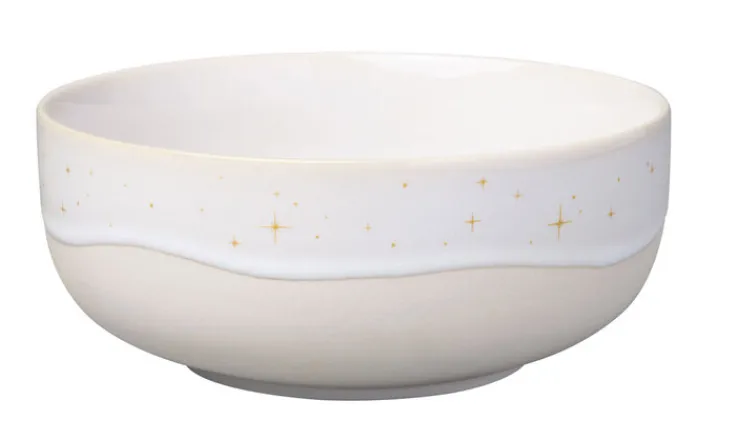 Wenn schon am Frühstückstisch weihnachtliche Stimmung aufkommt, werden die Festtage unvergesslich: Die Bowl WINTER GLOW von Villeroy & Boch Weihnachten ist aus weißem/beigem Porzellan gefertigt und zeigt in goldfarbigem Druck ein Stern-Schneeflocken-Motiv. Die Schale im Pottery-Stil wirkt luftig leicht wie eine Schneewehe, mit ihrem Durchmesser von 15 Zentimetern und einer Höhe von 6,5 Zentimetern eignet sie sich als Servierschale hervorragend.