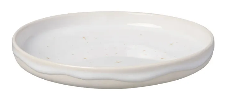 Die Schale ist weiß und beige gefärbt und mit einem zarten Muster aus goldfarbigen Sternen und Schneeflocken übersät, das ihr ein graziles Aussehen verleiht. Sie ist aus hochwertigem Porzellan gefertigt. Mit ihrem Durchmesser von 17 cm eignet sie sich optimal für Obst, Gebäck und verschiedene Desserts. Die runde, flache Schale im Pottery-Stil ist mikrowellenfest. Dank ihrer hellen, dezenten Farbgebung gliedert sie sich wunderbar in jedes Wohnambiente ein.