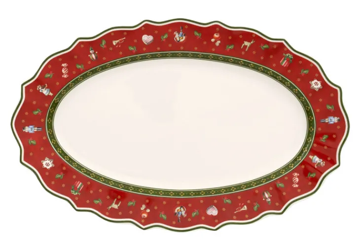Die ovale Servierplatte aus der Kollektion TOY´s DELIGHT von Villeroy & Boch hat ein klassisches Design und präsentiert sich festlich in den weihnachtlichen Farben rot, grün und gold. Durch die detailliert gestalteten Motive auf dem filigranen Rand ist die Platte mit den Maßen 24 x 37 cm ein Blickfang. Sie eignet sich zum Servieren von Beilagen oder auch von Gebäck oder Christstollen.