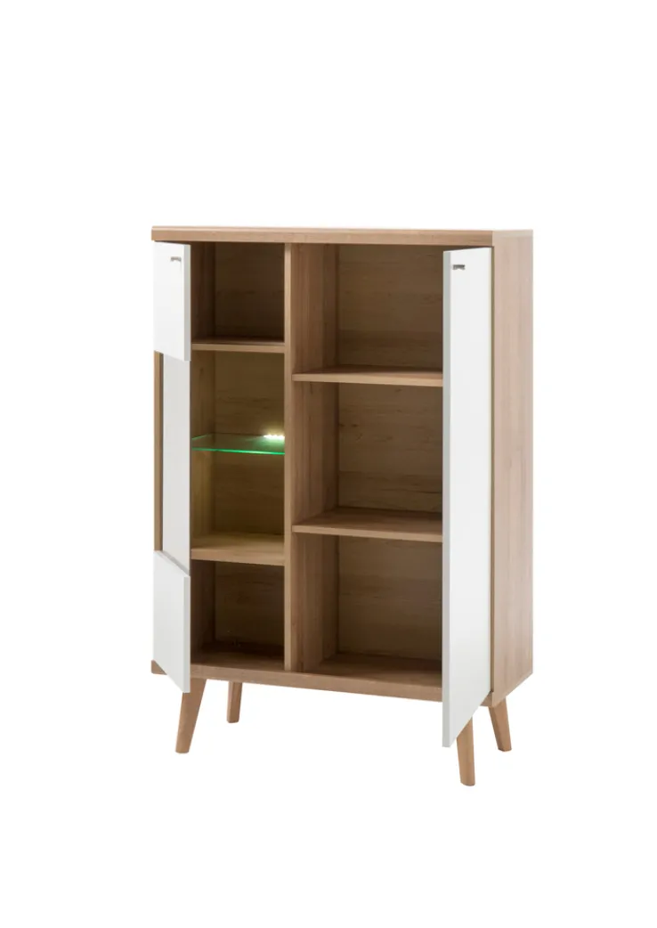Gefertigt aus Holznachbildung und Glas, besticht die Vitrine durch ihre klare Linienführung und die zwei Drehtüren, die einen einfachen Zugang zu den Innenfächern ermöglichen. Die Glasfront bietet einen Blick auf die dekorativen Elemente im Inneren, während die stabilen Holzbeine für einen sicheren Stand sorgen. Diese Vitrine ist die ideale Wahl für alle, die Wert auf stilvolle Aufbewahrungslösungen legen.