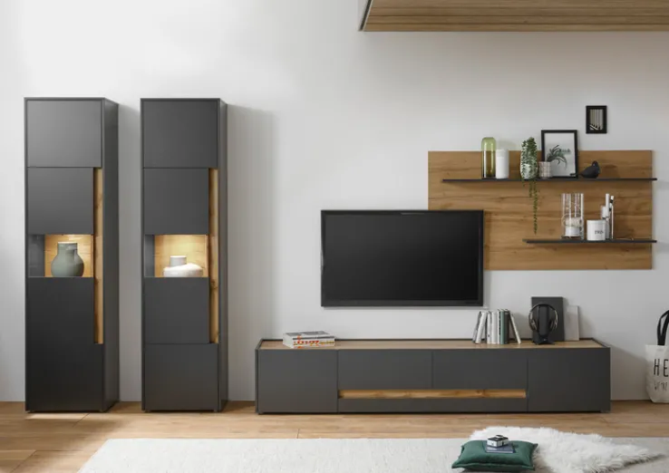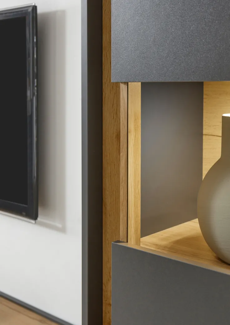 Die weißen Oberflächen der Vitrine bilden einen hervorragenden Kontrast zu den Innenfächern aus Eiche-Dekor. Dank der Tür mit Glas-Einsatz kann man Teile des Innenlebens jederzeit im Blick behalten. Die Vitrine CITY eignet sich somit nicht nur hervorragend für Wohnzimmer und Jugendzimmer, sondern kann auch in Gästezimmern auf ganzer Linie überzeugen. Eleganter Stauraum mit der ganz besonderen Note.