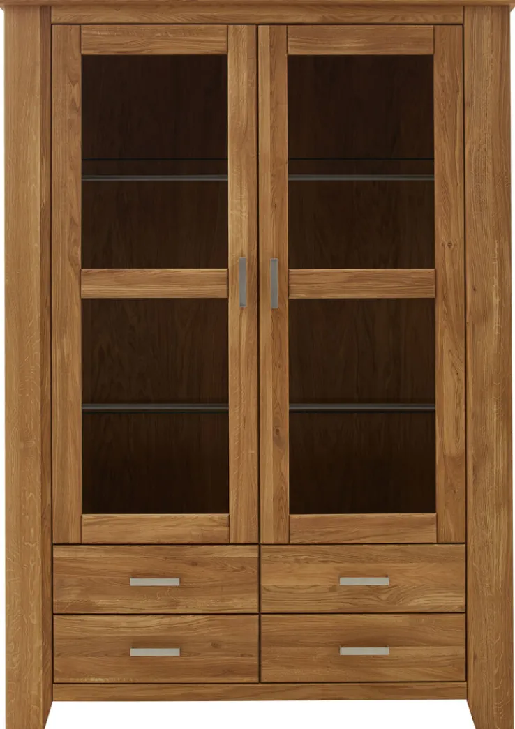 Massive Eiche ist nicht einfach ein Material für Möbel, sondern eine Investition. Das schöne Holz entwickelt im Lauf der Zeit eine natürliche Patina, die noch mehr Hochwertigkeit ausstrahlt. Landhausstil, mediterraner Stil oder nordisch eingerichtete Wohn- und Esszimmer – die Vitrine LOFT mit den zwei Drehtüren mit Glaseinsatz wirkt einfach überall exklusiv. Schlichte silberfarbige Griffe setzen sich von dem geölten Holz ab. Die Vitrine steht auf Füßen, sodass die Bodenreinigung darunter kein Problem ist.