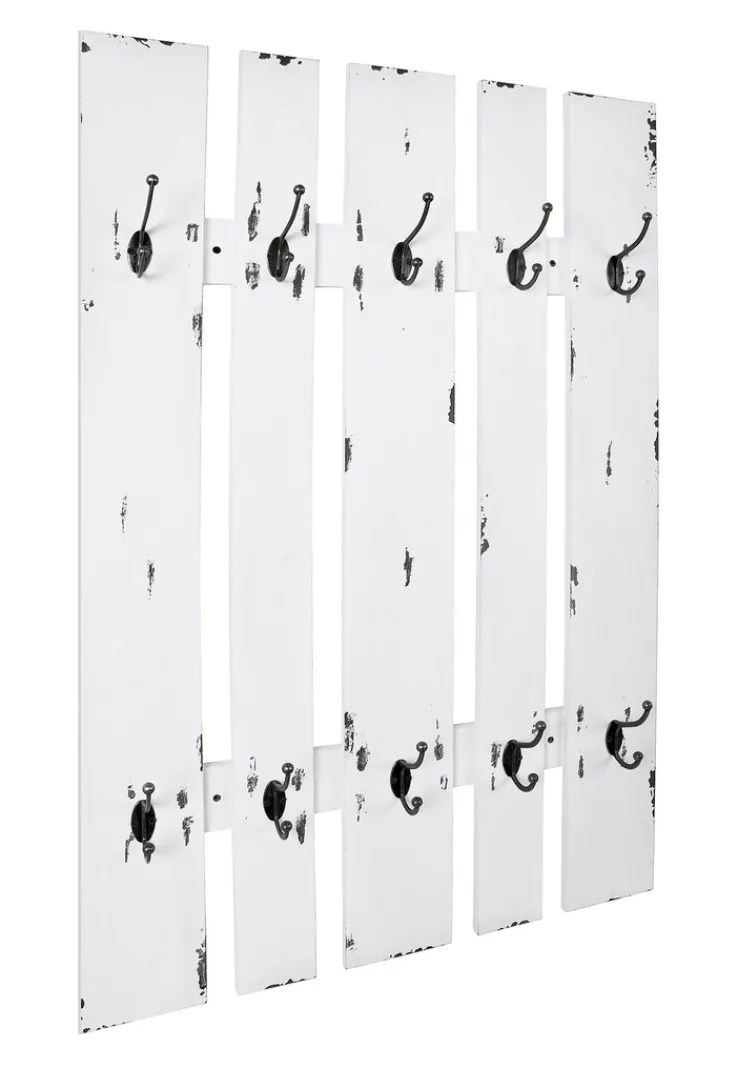 Die Wandgarderobe ist mit zehn schwarzen Haken aus robustem Metall ausgestattet. Daran können Sie Jacken, Mäntel, Schals und andere Dinge aufhängen. Die Haken sind an einer Basis aus einer palettenartigen Konstruktion aus MDF befestigt. Diese ist in Weiß gestrichen und begeistert mit einem coolen Used-Look. Da Sie die Garderobe an der Wand befestigen können, verbraucht sie keine Bodenfläche, sodass sie auch für kleine Flure perfekt geeignet ist. Außerdem erschlägt sie den Raum aufgrund ihrer hellen Farbe nicht, sondern trägt zu einer freundlichen Atmosphäre bei.