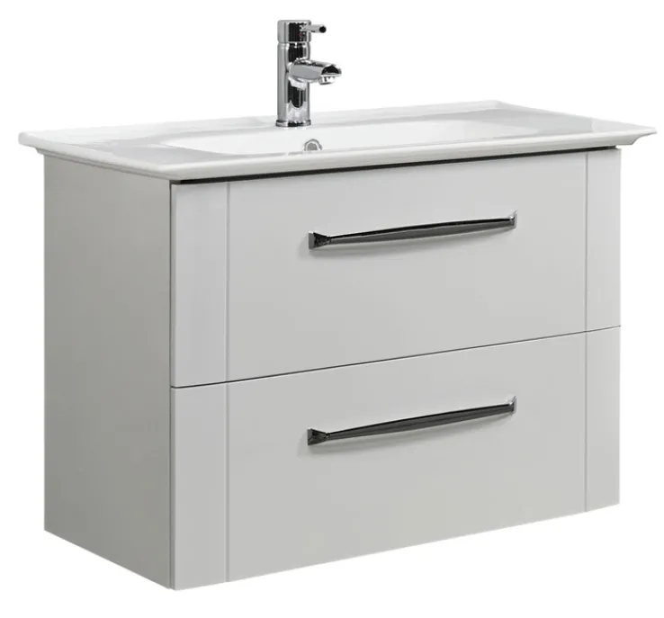 Gefertigt aus einer Holznachbildung, besteht der Unterschrank aus mitteldichter Faserplatte (MDF), was ihm eine robuste und langlebige Struktur verleiht. Die glatte Oberfläche ist pflegeleicht und trägt zur modernen Ästhetik des Möbelstücks bei. Die klaren Linien und die schlichten, verchromten Griffe unterstreichen das zeitgemäße Design und machen den Unterschrank zu einem funktionalen und stilvollen Element in jedem Badezimmer.