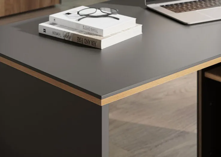 Der Winkelschreibtisch aus der Serie PODIUM vereint Funktionalität und modernes Design. Mit einer Breite von 145 cm und einer Höhe von 75 cm bietet er ausreichend Platz für Ihre Arbeitsutensilien. Die Kombination aus Graphit und Navarra-Eiche verleiht dem Tisch eine elegante Optik, die sich nahtlos in verschiedene Einrichtungsstile einfügt. Die Oberfläche besteht aus einer robusten Holznachbildung mit Melaminharzbeschichtung, die für Langlebigkeit und einfache Pflege sorgt.
