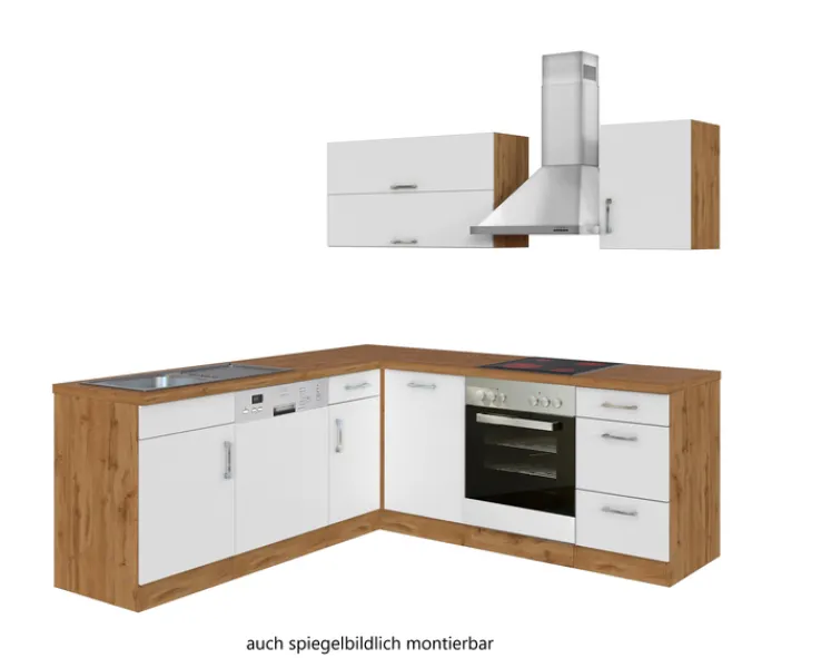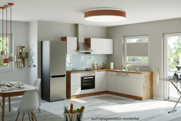 Einfach perfekt! Bei dieser platzsparenden Küchenzeile sind Backofen, Dunstesse und Geschirrspüler bereits integriert. Durch die L-Form ist die ODENSE Kombination ein Traum für alle, die kurze Arbeitswege in der Küche bevorzugen. Auch Wände mit Fenstern lassen sich dank der einzelnen Module bestens nutzen. Die Optik der Winkelzeile überzeugt ebenfalls, liegen doch weiße Küchen mit holzfarbenen Elementen voll im Trend. Die Küchenzeile wird zerlegt geliefert.